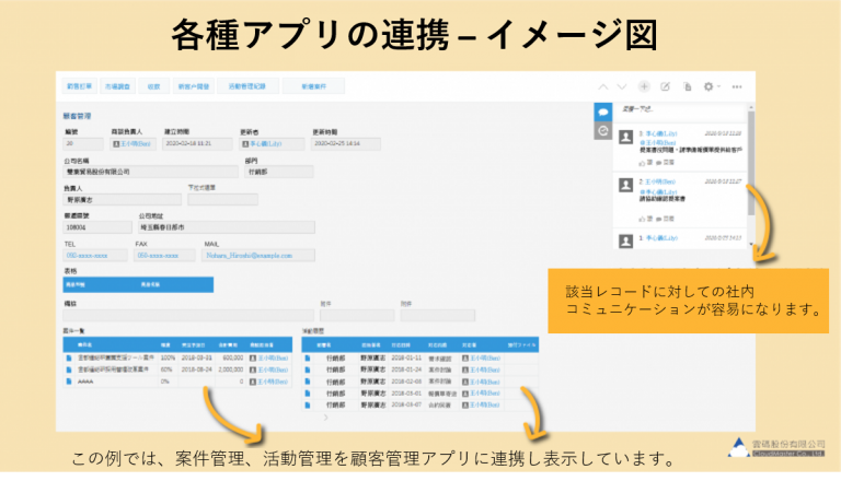 各種関連アプリを連携することで、情報の管理が更に効率化されます。この例で言うと、顧客管理アプリを参照するだけで、該当顧客との案件情報や、活動履歴を一括して参照することが出来ます。連携されたアプリの情報は、レコードをクリックすることで、該当アプリに移動し、詳細を確認できます。